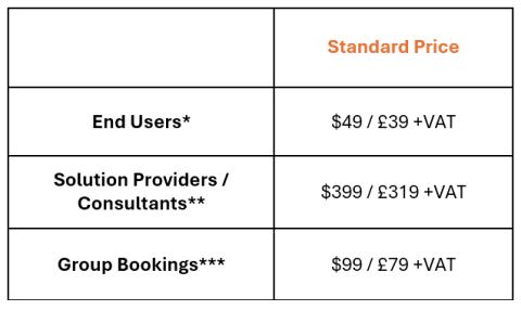 Use this category if there are multiple people within the same organization who would like to attend. Simply register one person now, and you will receive instructions via email on how to add up to 30 colleagues. This pass is only available for End Users.